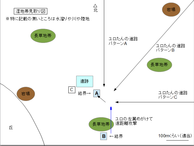 遠距離攻撃手段を有する者はB地点にて草むらに隠れておくこと。